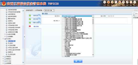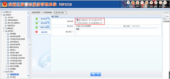 進入登記機關確認界面,點擊左側【確認信息】,選擇審核結果,填寫好確認意見后,點擊下方【提交】,即登記機關已確認,也可選擇駁回,企業(yè)在外網(wǎng)重新進行登記機關的選擇。