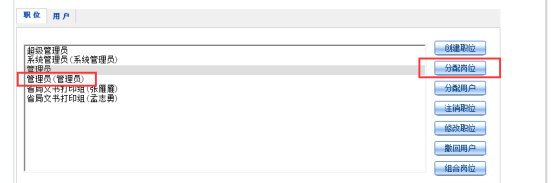 4.在“職位”選項(xiàng)卡下找到對(duì)應(yīng)的職位人員信息,選中,點(diǎn)擊右側(cè)“分配崗位”,給人員分配權(quán)限,如圖59: