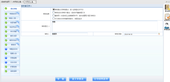 輸入審核意見,點擊【材料核審】,系統(tǒng)會彈出需設(shè)立終審的工作人員,提交給該人員后,該人員進(jìn)行設(shè)立登記終審