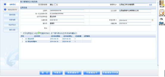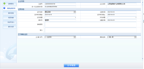 設立登記審核后,進入證照打印流程:點擊【保存】,系統(tǒng)進入紙質(zhì)證照打印界面