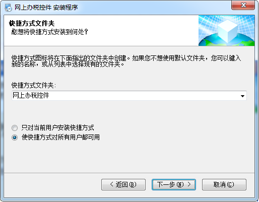 3. 點擊[下一步]按鈕,選擇快捷方式文件夾名稱(快捷方式文件夾的默認名稱為網(wǎng)上辦稅控件)。