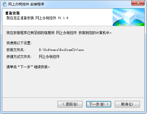 4. 點擊[下一步]按鈕,會提示“現(xiàn)在您正準(zhǔn)備安裝 網(wǎng)上辦稅控件1.1.8”,并顯示安裝文件夾路徑和快捷方式文件夾名稱。