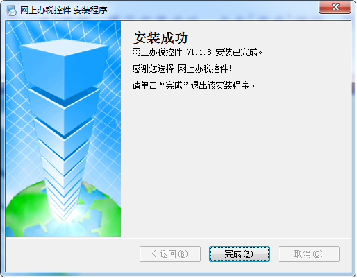 5. 點擊[下一步]按鈕,提示安裝成功。點擊[完成]按鈕,網(wǎng)上辦稅控件安裝包安裝成功。
