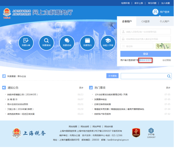 網(wǎng)上辦稅服務(wù)廳登陸頁面,點擊“用戶登錄”圖標(biāo),選擇“企業(yè)用戶”界面,點擊[登錄]按鈕下方[基礎(chǔ)安全控件]鏈接下載控件。