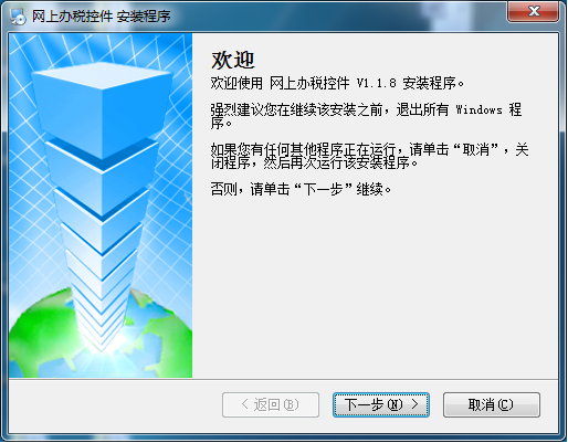 1. 雙擊“setup(ForKey) V1.1.8”安裝包,彈出“網(wǎng)上辦稅控件安裝包 安裝程序”安裝界面。(友情提示:安裝控件前要關(guān)閉所有瀏覽器)。