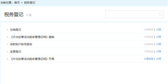 點擊“我要辦事”菜單—“稅務(wù)登記”欄目,進入“稅務(wù)登記”事項列表。點擊[辦事指南]按鈕,查閱辦事指南。點擊[辦理]按鈕,辦理對應(yīng)事項。