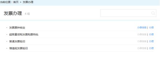 點擊“我要辦事”菜單—“發(fā)票辦理”欄目,進入“發(fā)票辦理”事項列表。點擊[辦事指南]按鈕,查閱辦事指南。點擊[辦理]按鈕,辦理對應事項。