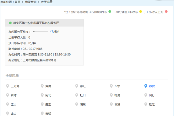 點擊“我要查詢”菜單的“大廳流量”欄目,可以查詢?nèi)懈鬓k稅服務(wù)廳當(dāng)日辦理涉稅業(yè)務(wù)的排隊情況。