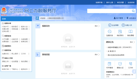 成功登錄網上辦稅服務廳,進入網上辦稅服務廳主頁。