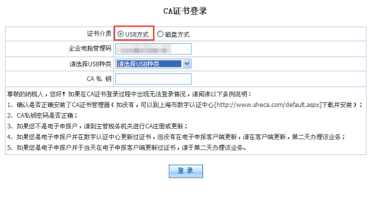 (2)CA證書登錄。點擊[用戶登錄]圖標,在用戶登錄框內選擇“CA登錄”界面,在電腦上插入CA證書,輸入CA證書密碼,點擊[登錄]按鈕,登錄網上辦稅服務廳。