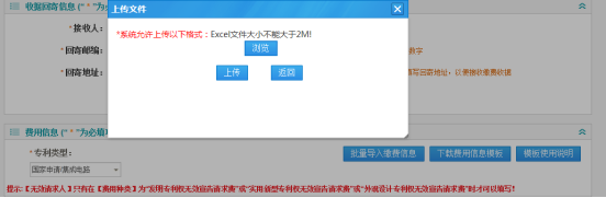 在EXCEL中依次輸入申請?zhí)枴①M用種類、費用金額,注意一行只能填寫一種費用種類,一個申請?zhí)柸衾U納多種費用則需填寫多行,當(dāng)費用種類選擇“XX專利權(quán)無效宣告請求費”時還應(yīng)輸入“無效申請人”。