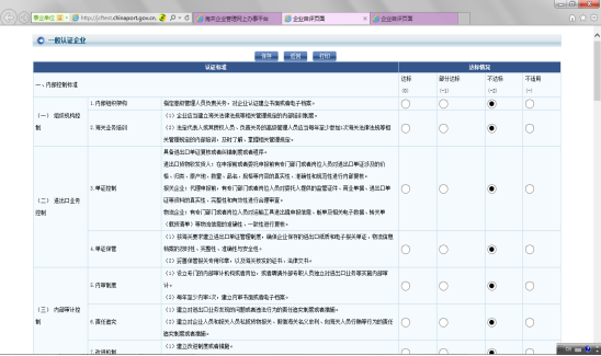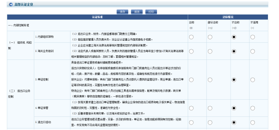 自我評估材料界面根據(jù)選擇的認(rèn)證類型不同而展示相應(yīng)的內(nèi)容,分別為“一般認(rèn)證”和“高級認(rèn)證”的海關(guān)認(rèn)證企業(yè)標(biāo)準(zhǔn)。上圖所示為一般認(rèn)證標(biāo)準(zhǔn)的界面,高級認(rèn)證標(biāo)準(zhǔn)的界面如下圖所示: