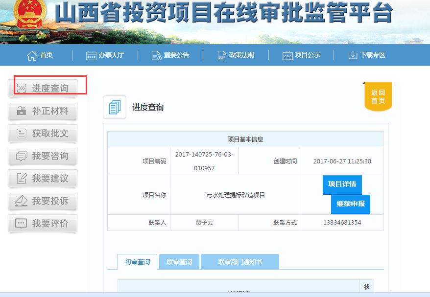 登錄系統(tǒng)后可對項目辦理進度進行查詢,可根據(jù)材料補正通知進行材料補正,可以獲取辦結(jié)事項的批文,并可進行建議
