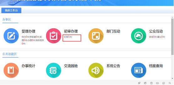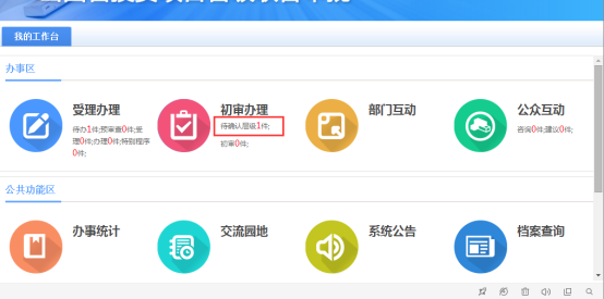 某些審批事項需要相應(yīng)部門出具初審意見或確認函等文件時,需要部門管理員進入“初審辦理”模塊上傳相應(yīng)初審材料。