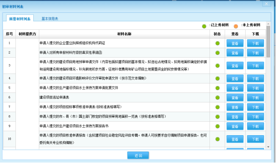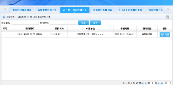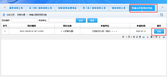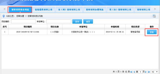 可以在“初審材料待辦列表”中查看待辦事項所需要的材料,在初審材料辦理列表中進行材料的提交,材料提交后該業(yè)務(wù)出現(xiàn)在“初審辦結(jié)列表”中??梢酝ㄟ^項目編碼、申報單位來查看初審需上傳的材料。