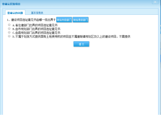 選擇部門層級,若為本層級選擇相應(yīng)事項后,點擊“提交”;若不屬于本層級直接選擇轉(zhuǎn)給相應(yīng)層級部門由該部門進行下一步處理。