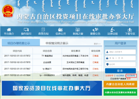 項(xiàng)目單位在網(wǎng)上辦事大廳頁(yè)面用戶登錄界面下方點(diǎn)擊“忘記賬號(hào)”。