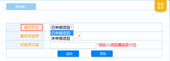進(jìn)入到下圖找回界面,查找方式分為兩種:已申報(bào)項(xiàng)目和未申報(bào)項(xiàng)目,申請(qǐng)人選擇【查找方式】之后,【查找關(guān)鍵字】下拉框中會(huì)有對(duì)應(yīng)選項(xiàng),選擇【查找關(guān)鍵字】后,輸入【關(guān)鍵字內(nèi)容】,點(diǎn)擊“查詢”按鈕即可。
