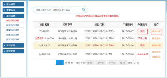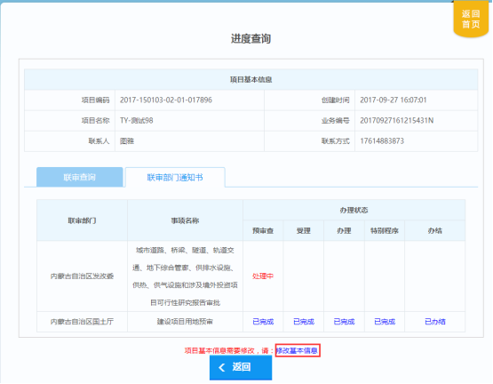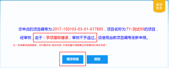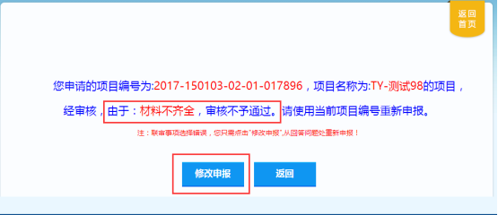 項(xiàng)目單位點(diǎn)擊“修改申報(bào)”,會(huì)提示退回的原因,再點(diǎn)擊“修改申報(bào)”按鈕,從【填寫(xiě)基本信息】處開(kāi)始重新申報(bào)。