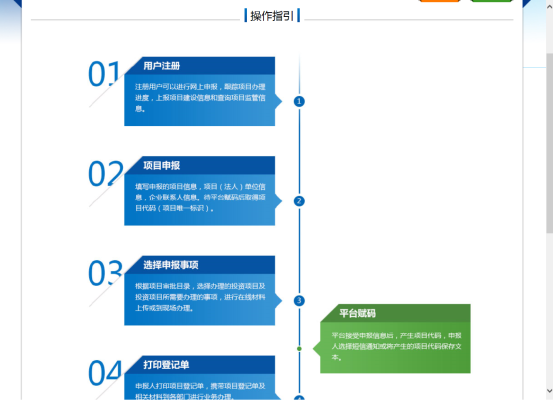 如對(duì)系統(tǒng)辦事流程不熟悉可在首頁(yè)點(diǎn)擊操作指引,操作指引簡(jiǎn)要的概述了本系統(tǒng)辦事流程供申報(bào)人參考。如圖35所示。
