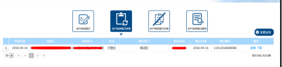 狀態(tài)為“已登記”數(shù)據(jù),登記成功后,點擊“下載”按鈕,可下載《動產(chǎn)抵押登記變更書》,打印提交抵押人或抵押權(quán)人。