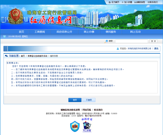 第二步:認(rèn)真閱讀【服務(wù)條款】,點(diǎn)擊【接受】按鈕,進(jìn)入登記和備案信息,點(diǎn)擊【不接受】返回登錄界面。在此以點(diǎn)擊【接受】為例。