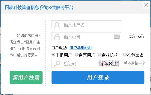 輸入用戶名、密碼及驗證碼,選擇申報用戶,點擊“登錄”按鈕,登錄成功系統(tǒng)彈出相應提示,將進入國家科技管理信息系統(tǒng)公共服務平臺首頁。
