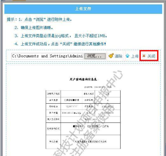 (3)點擊“瀏覽”選擇需要上傳的密碼查詢信息表的掃描件,如果選擇不正確,可以點擊“清除”后重新選擇。