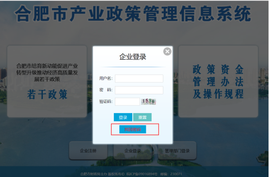 如果用戶忘記了自己的登陸密碼,首先登陸到產(chǎn)業(yè)政策管理系統(tǒng)首頁,然后點(diǎn)擊“企業(yè)登錄”的按鈕,如下圖:
