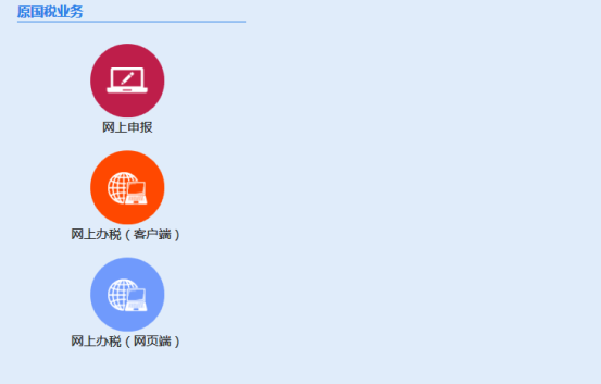 原國稅業(yè)務(wù)包含三大功能,分別是網(wǎng)上申報(bào)、網(wǎng)上辦稅(客戶端)、網(wǎng)上辦稅(網(wǎng)頁端)。點(diǎn)擊網(wǎng)上申報(bào)、網(wǎng)上辦稅(客戶端)功能時(shí),如果用戶電腦上尚未安裝原北京國稅報(bào)稅軟件,系統(tǒng)會(huì)自動(dòng)下載安裝原國稅報(bào)稅軟件,安裝完成后再次點(diǎn)擊即可;如果用戶電腦上已經(jīng)安裝原北京國稅報(bào)稅軟件,系統(tǒng)會(huì)自動(dòng)打開原國稅報(bào)稅軟件對(duì)應(yīng)的功能,不需要再次登錄認(rèn)證。