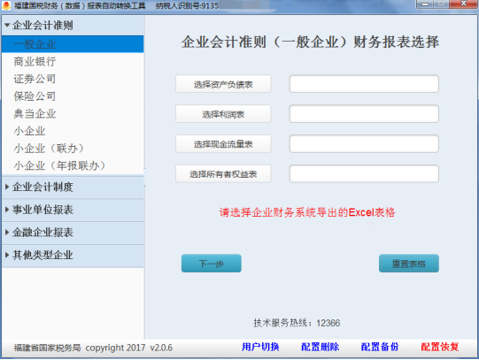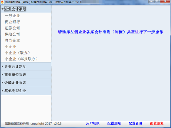 (1)轉(zhuǎn)換之前,需要先輸入納稅人識(shí)別號,然后在“企業(yè)類型”(財(cái)務(wù)報(bào)表類型)選擇報(bào)表類型,不同企業(yè)類型的企業(yè)對應(yīng)的報(bào)表有所不同,這里以選擇“企業(yè)會(huì)計(jì)準(zhǔn)則(一般企業(yè))財(cái)務(wù)報(bào)表報(bào)送與信息采集”為例,選完后界面如圖3-1所示。