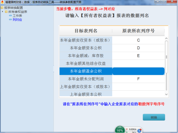 (2)所有者權(quán)益變動(dòng)表的列對應(yīng)。需要轉(zhuǎn)換的所有者權(quán)益變動(dòng)表科目如圖3-7所示,本年金額的實(shí)收資本(股本)在C列,因此原表所在列序號填C(大小寫均可),如圖3-8所示,其余科目類推。