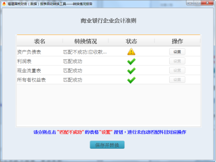 3、個(gè)性化科目設(shè)置。參數(shù)設(shè)置完成后,點(diǎn)擊“轉(zhuǎn)換”按鈕,進(jìn)行報(bào)表轉(zhuǎn)換,結(jié)果如圖3-9所示,利潤表、現(xiàn)金流量所有者權(quán)益表轉(zhuǎn)換成功,資產(chǎn)負(fù)債表仍然存在匹配不成功的項(xiàng)目。需要點(diǎn)擊后面操作的“設(shè)置”按鈕對“匹配不成功”的科目進(jìn)行人工對應(yīng)。