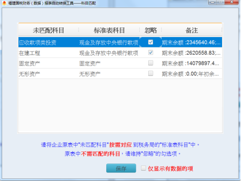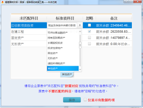 “匹配不成功”科目設(shè)置。如圖3-10所示,未匹配科目有應(yīng)收賬款、固定資產(chǎn)和無形資產(chǎn),默認(rèn)狀態(tài)下都為忽略不轉(zhuǎn)換,其中無形資產(chǎn)的期末余額和年初余額為0,勾選右下角“僅顯示有數(shù)據(jù)的項(xiàng)”可以屏蔽數(shù)據(jù)都為0的科目。以應(yīng)收款項(xiàng)類投資配置為例,點(diǎn)擊標(biāo)準(zhǔn)表科目,選擇對應(yīng)的標(biāo)準(zhǔn)科目“其他資產(chǎn)”,即將企業(yè)表的“應(yīng)收款項(xiàng)類投資”科目數(shù)據(jù)添加到金三標(biāo)準(zhǔn)表的“其他資產(chǎn)”目錄下。依次對企業(yè)未匹配科目進(jìn)行設(shè)置,如未匹配科目數(shù)據(jù)不需要體現(xiàn)在金三標(biāo)準(zhǔn)表中,則保持忽略狀態(tài)即可。