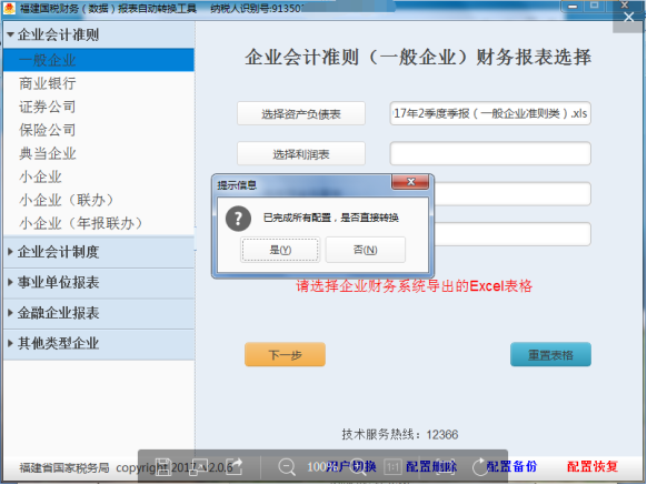 提示納稅人已經(jīng)完成所有取數(shù)范圍、科目對應(yīng)的初始化設(shè)置,是否同意直接轉(zhuǎn)換。如選“是”,直接進(jìn)入圖3-12所示稅局標(biāo)準(zhǔn)表轉(zhuǎn)換步驟;如選“否,則重新進(jìn)入如圖3-4及后續(xù)的初始化配置步驟(以往配置內(nèi)容均保留)。
