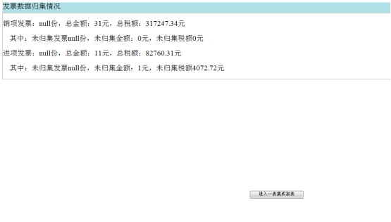 圖中數(shù)據(jù)歸集情況為企業(yè)進(jìn)銷項(xiàng)匯總數(shù)據(jù),其中未歸集發(fā)票的數(shù)據(jù)是開具時(shí)未選擇商品編碼的發(fā)票數(shù)據(jù)匯總;點(diǎn)擊【進(jìn)入一表集成報(bào)表】按鈕進(jìn)入一表集成的報(bào)表數(shù)據(jù)填寫。