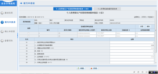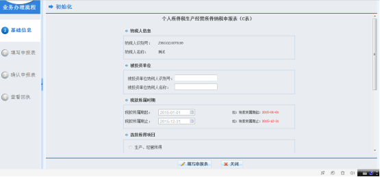 1、依次點(diǎn)擊菜單【申報(bào)繳稅—納稅申報(bào)--生產(chǎn)、經(jīng)營(yíng)所得個(gè)人所得稅納稅申報(bào)(C表)】,點(diǎn)擊【申報(bào)】按鈕進(jìn)入申報(bào)初始化頁(yè)面,如下圖所示。