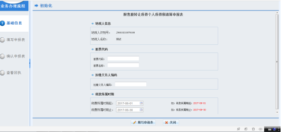 1、依次點擊菜單【申報繳稅—納稅申報—限售股轉讓所得個人所得稅清算申報表】,點擊【申報】按鈕進入申報初始化頁面,如下圖所示。