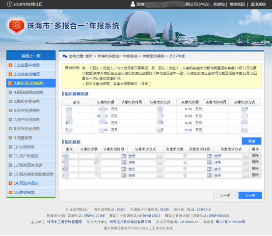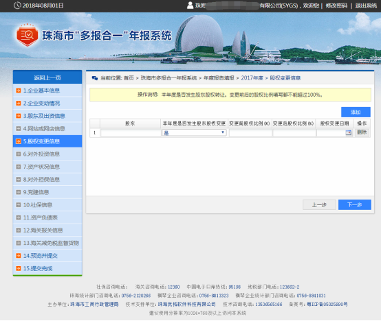 第七步:股權(quán)變更信息,點(diǎn)擊【添加】按鈕,錄入相關(guān)股權(quán)變更信息,點(diǎn)擊【下一步】按鈕。注:企業(yè)基本信息頁(yè)數(shù)據(jù)項(xiàng)“是否有股權(quán)變更信息”選擇了“是”才會(huì)顯示。