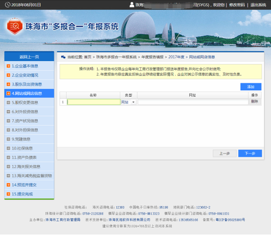 第六步:網(wǎng)站或網(wǎng)店信息,點(diǎn)擊【添加】按鈕,錄入名稱、網(wǎng)址,點(diǎn)擊【下一步】按鈕。注:企業(yè)基本信息頁(yè)數(shù)據(jù)項(xiàng)“是否有網(wǎng)站或網(wǎng)店信息”選擇了“是”才會(huì)顯示。