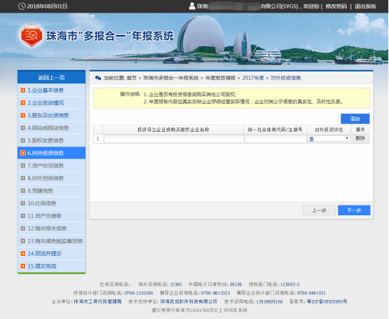 第八步:對(duì)外投資信息,點(diǎn)擊【添加】按鈕,錄入相關(guān)對(duì)外投資信息,點(diǎn)擊【下一步】按鈕。注:企業(yè)基本信息頁(yè)數(shù)據(jù)項(xiàng)“是否有對(duì)外投資信息”選擇了“是”才會(huì)顯示。