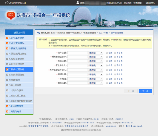 第九步:資產(chǎn)狀況信息,錄入相關(guān)資產(chǎn)狀況信息,選擇公示或不公示,點(diǎn)擊【下一步】按鈕。