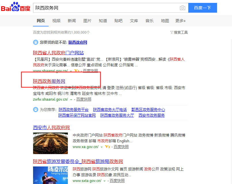 1.進入陜西政務(wù)服務(wù)網(wǎng):百度搜索“陜西政務(wù)服務(wù)網(wǎng)”,注意陜西政務(wù)服務(wù)的網(wǎng)址為:http://zwfw.shaanxi.gov.cn/(陜西政務(wù)服務(wù))