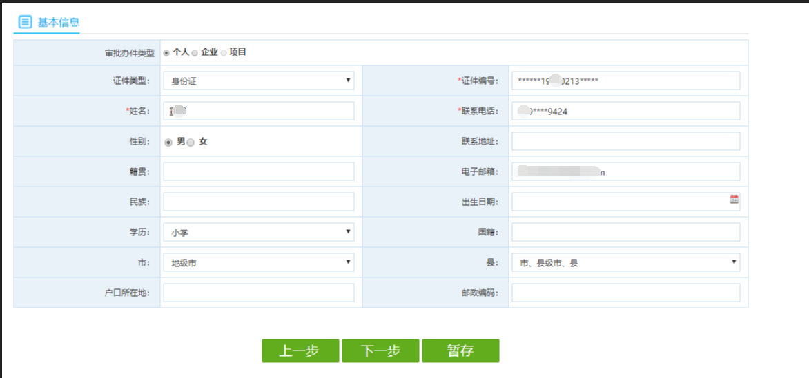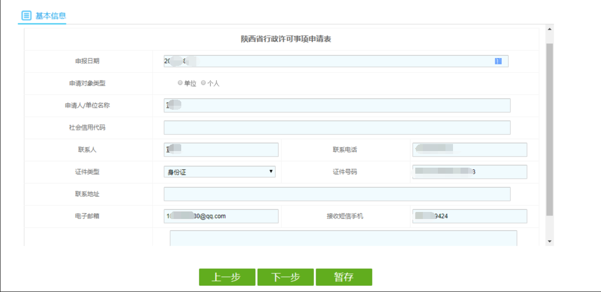 9.申報信息,填寫基本信息(注冊賬號時填寫的信息會自動填充),如需修改,可直接進行修改,填寫完畢點擊下一步。注意:帶*為必填項。