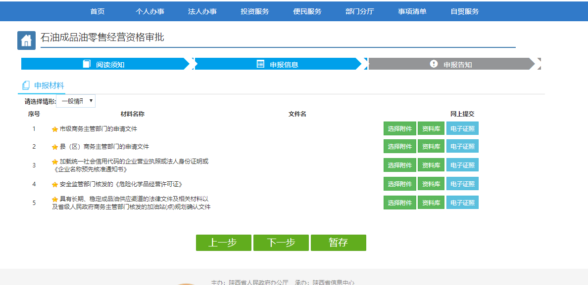 的材料為必要材料,材料可以點擊“選擇附件”從本地上傳,也可點擊“資料庫”選擇當前賬戶之前上傳過的電子材料,還可從“電子證照”中選擇西安服務(wù)網(wǎng)申報產(chǎn)生的證照信息。