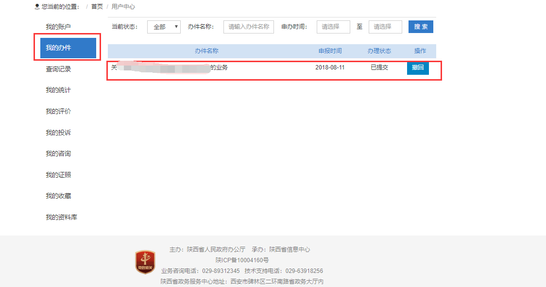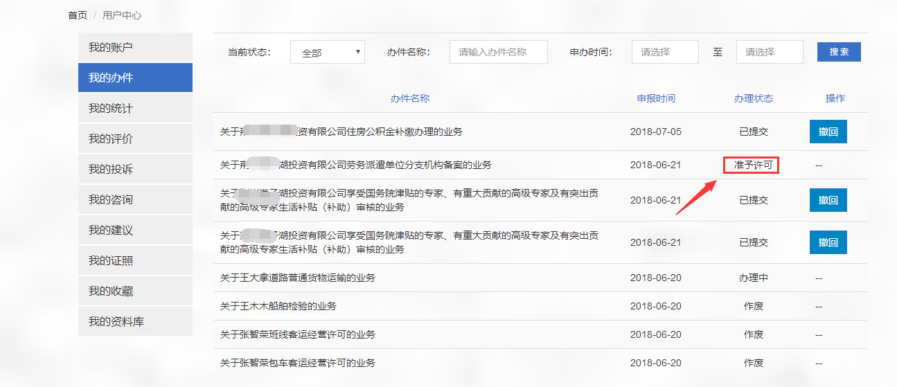 15.查詢辦理進度,點擊右上角“用戶中心”查看我的辦件,可以查詢當前用戶申報的業(yè)務(wù)詳情。