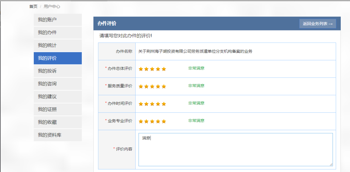 18.點擊用戶中心-我的評價可對已辦結(jié)的件進行辦件評價。