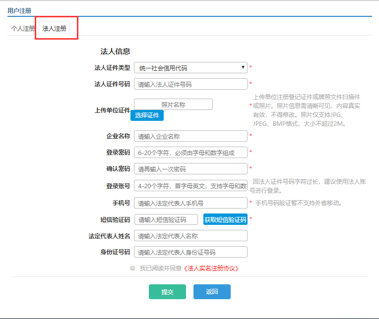 3.用戶注冊:點擊右上角注冊-法人注冊:(1)用戶注冊界面,填寫企業(yè)信息和法人信息,填寫完畢點擊實名認證,(2)創(chuàng)建用戶界面,填寫賬號密碼,點擊注冊。認證過程約30秒,法人代表將收到系統(tǒng)認證通過短信。