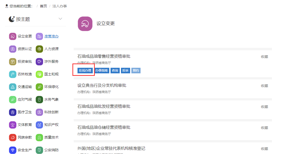 7.在辦事指南頁面可以查看受理條件、申請材料、辦理時限、下載樣表/空白表格等,點擊“在線辦理”按鈕進行申報。
