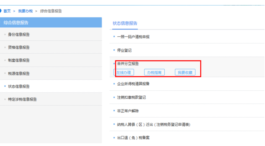 登錄路徑:【我要辦稅】—【綜合信息報(bào)告】—【狀態(tài)信息報(bào)告】—【合并分立報(bào)告】—【在線辦理】